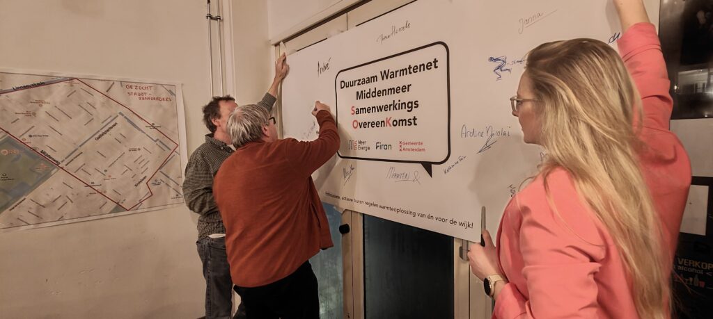 Samen met de gemeente Amsterdam en infraspecialist Firan tekenden wij een samenwerkingsovereenkomst voor de realisatie van ons warmtenet. Donderdag 29 februari werd de ondertekening van deze samenwerkingsovereenkomst feestelijk gevierd met een groep enthousiaste en actieve vrijwilligers. We tekenden de samenwerkingsovereenkomst symbolisch nog een keer; nu niet alleen met de partners, maar ook met deze groep vrijwilligers!